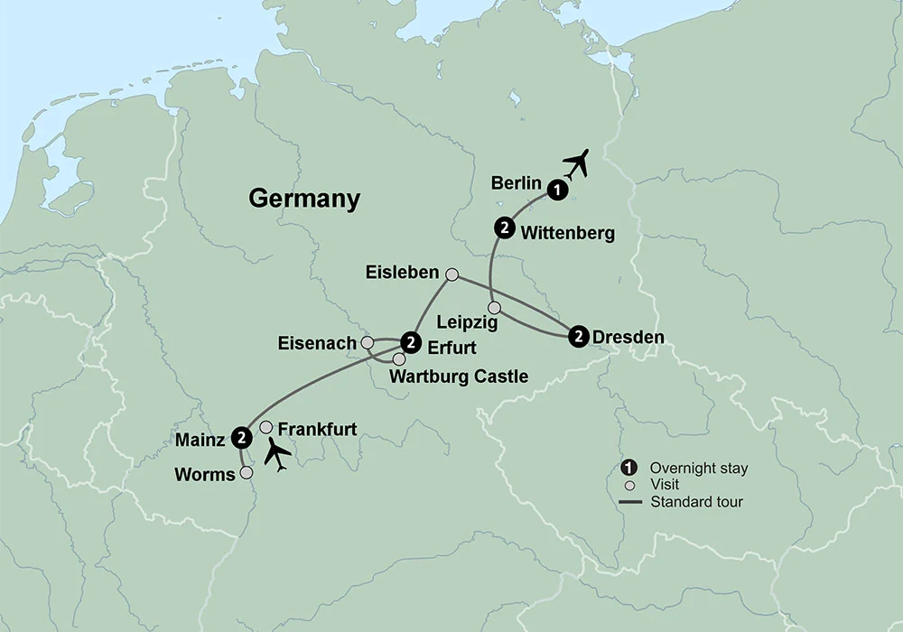 Join us as we follow in the footsteps of Martin Luther. Begin in Mainz, home to the Gutenberg Museum and famous printed Bible. Come to know Worms, and the very spot where Martin Luther refused to recant before the Imperial Diet on a guided walking tour. Visit Wartburg castle, Luther’s sanctuary after being “outlawed.” Here he spent his time translating the Bible into German. Enjoy a musical performance played on medieval instruments inside the home of Johann Sebastian Bach. Discover Leipzig’s St. Thomas Cathedral. Visit Eisleben where Luther was born and died and explore the museum inside the home he was born in. Tour the Augustinian Monastery where Luther studied, and enjoy a prayer service. Travel to Wittenberg to visit the grounds of Wittenberg University with its Luther house, the city church where Luther offered services, and the Castle Church where he set off the reformation by nailing his Ninety-Five Theses to the church door. Have services in one of the medieval churches from Luther’s time. Spend two nights in the lovely old town of Dresden along the banks of the river Elbe. Enjoy unique dinners, including a cellar dinner and a brewery tour, where you sample beers before a typical German meal. This epic journey takes you across Germany and deep into the history of Lutheranism.